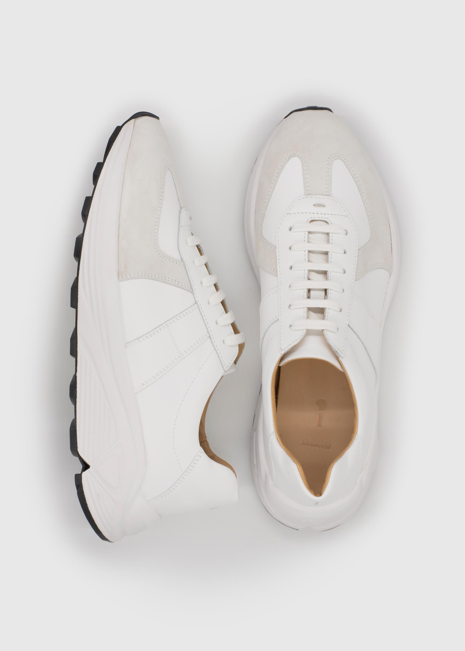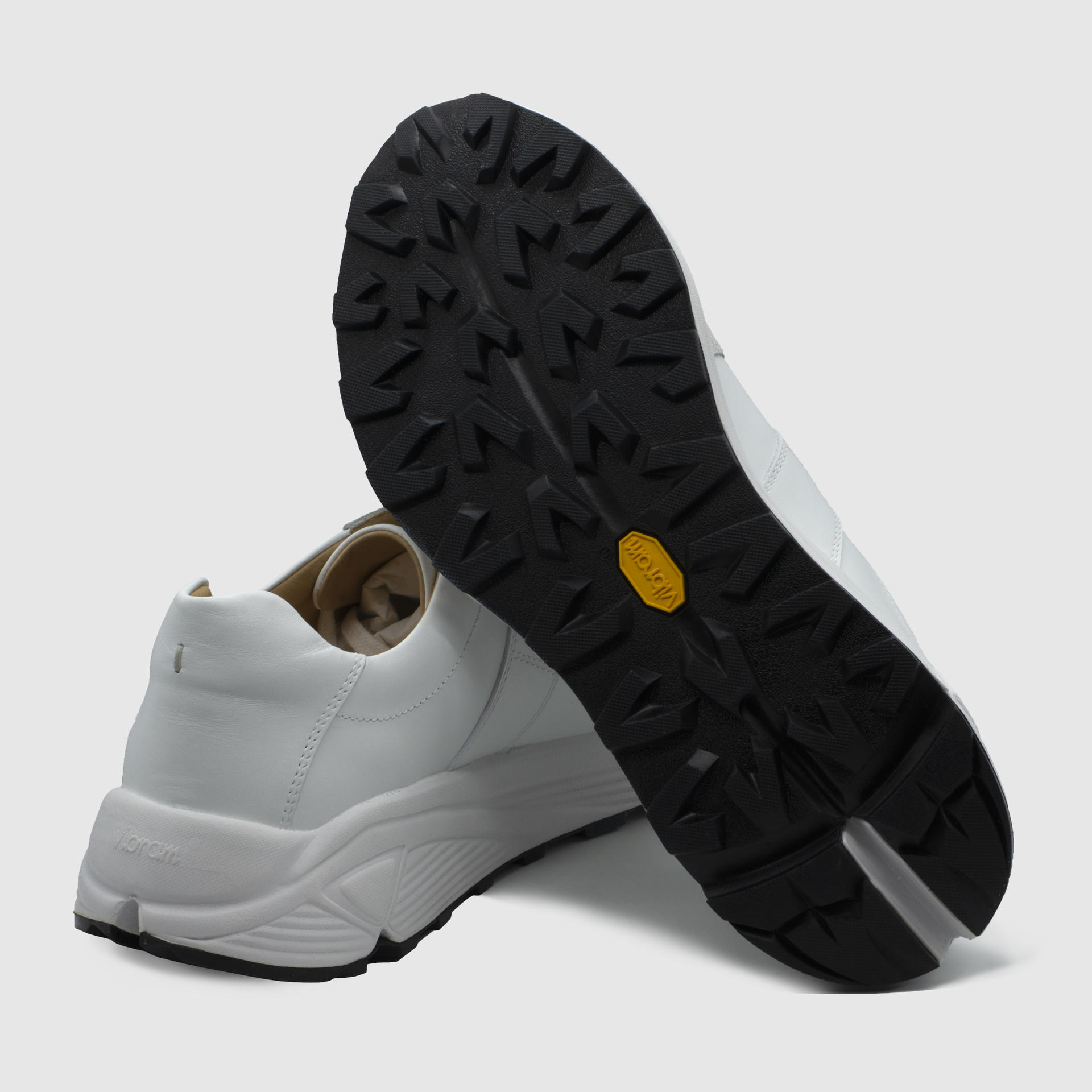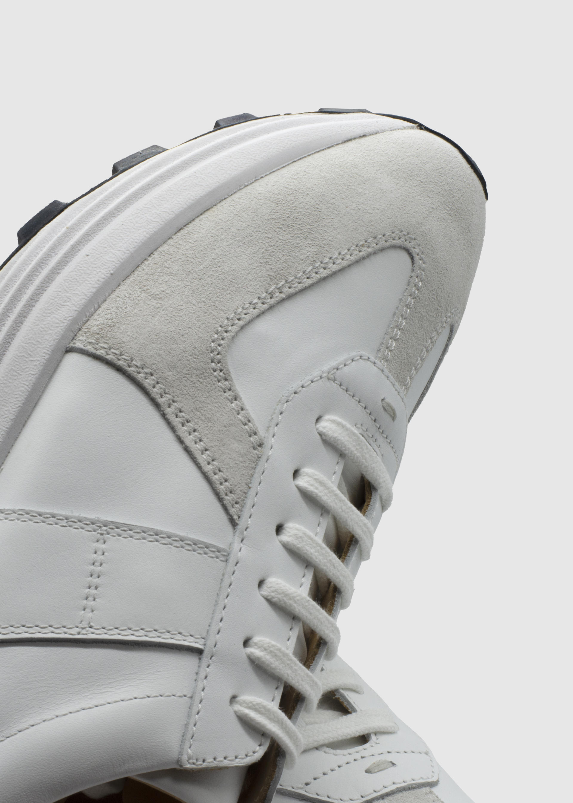 화이트 색상의 송아지 가죽 로우탑 러너 둥그런 신발 앞코. 신발 끈으로 조임처리. 여섯 개의 끈 구멍. 신발 뒷 축에 시그니쳐 'I' 로고 스티칭. 송아지 가죽으로 내부 처리. 가죽색상과 동일한 색상의 스티치. 굽 높이 5.5cm.