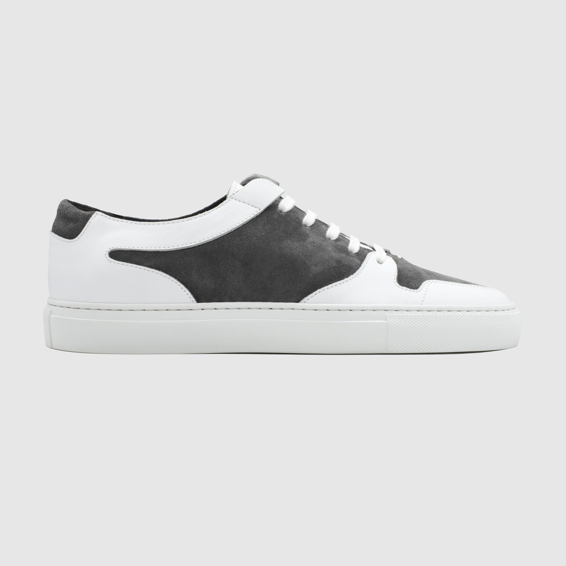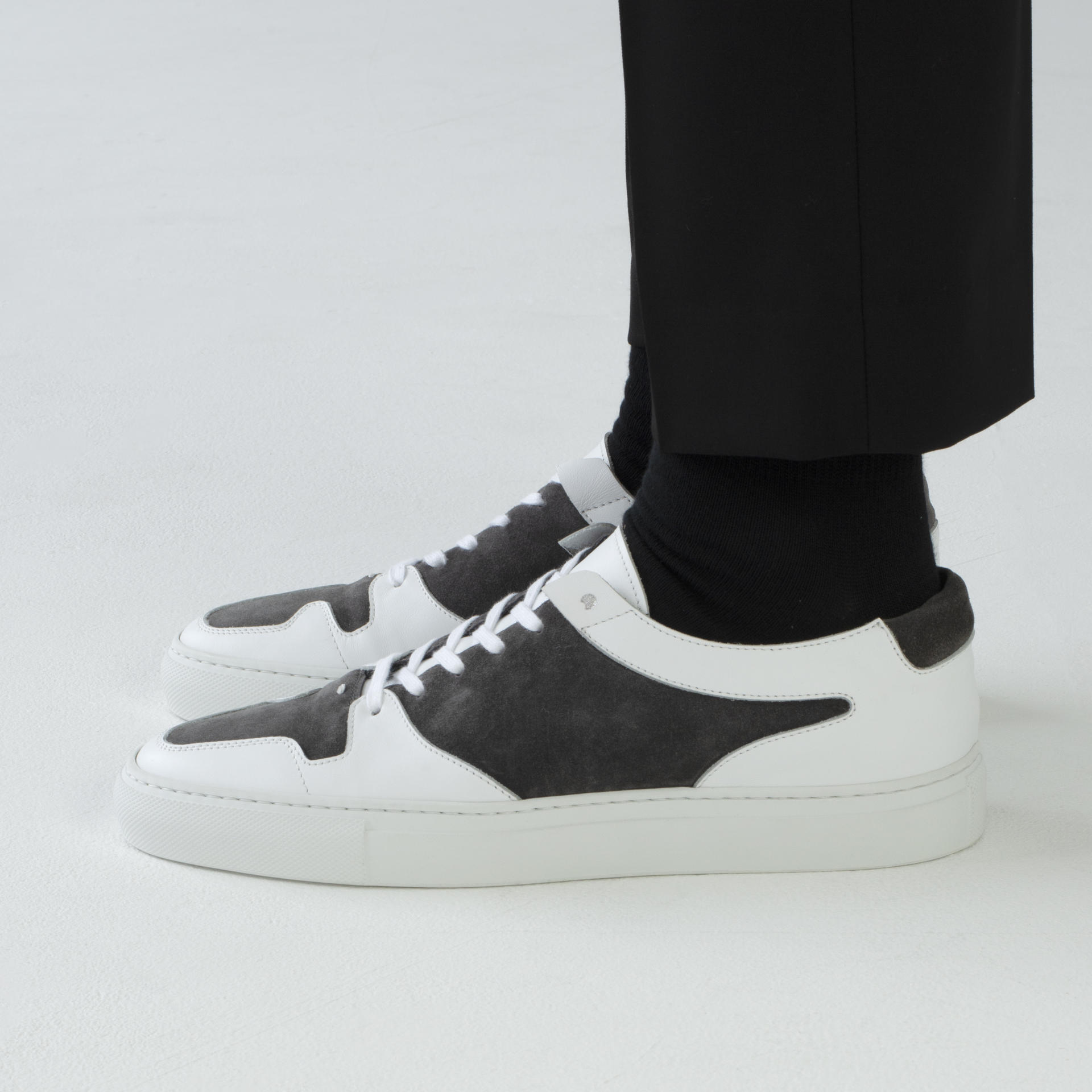 다크그레이 색상의 송아지 스웨이드 가죽 로우탑 스니커즈. 둥그런 신발 앞코. 신발 끈으로 조임처리. 여섯 개의 끈 구멍. 천연고무 아웃솔. 신발 갑피부분의 왼쪽 상단 가장자리에 은박 필름으로 로고 처리. 밑창과 송아지 가죽을 바느질로 이어 연결. 송아지 가죽으로 내부 처리. 가죽색상과 동일한 색상의 스티치. 굽 높이 3.5cm.