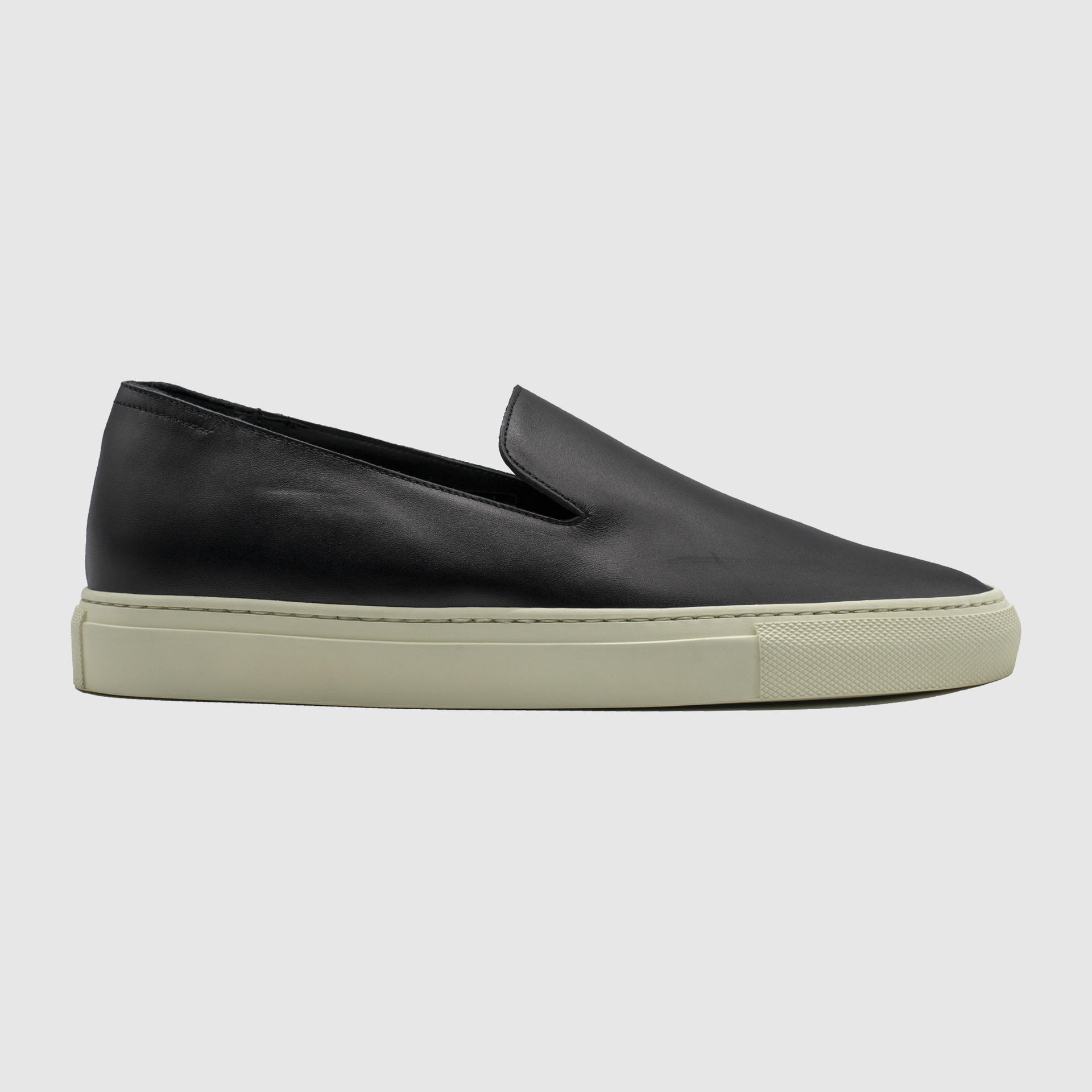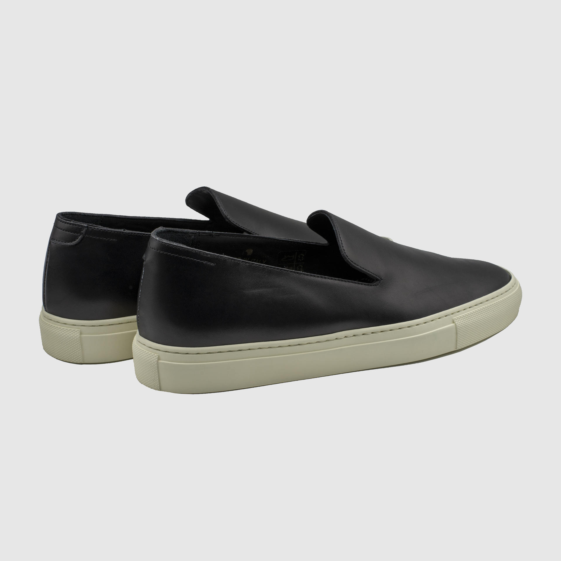 블랙 색상의 송아지 스웨이드 슬립온. 둥그런 신발 앞코. 왼쪽 상단 가장자리에 금색 필름으로 음각 로고 처리. 밑창과 송아지 가죽을 바느질로 이어 연결. 빈티지 아웃솔. 송아지 가죽으로 내부 처리. 가죽색상과 동일한 색상의 스티치. 굽 높이 3cm.