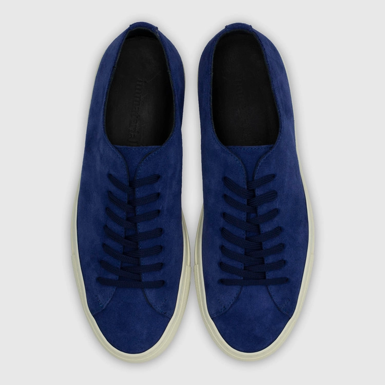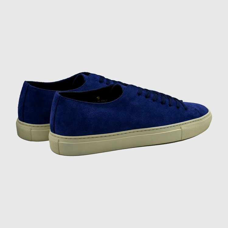 빈티지잉크 색상의 송아지 스웨이드 가죽 로우탑 스니커즈. 둥그런 신발 앞코. 신발 끈으로 조임처리. 일곱 개의 끈 구멍. 신발 베라 부분의 왼쪽 상단 가장자리에 금색 필름으로 음각 로고 처리. 밑창과 송아지 가죽을 바느질로 이어 연결. 송아지 가죽으로 내부 처리. 가죽색상과 동일한 색상의 스티치. 굽 높이 3.5cm.