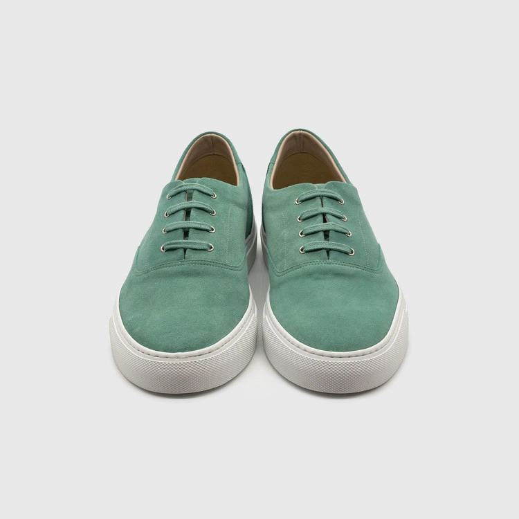 민트 색상의 송아지 스웨이드 가죽 로우탑 스니커즈. 둥그런 신발 앞코. 신발 끈으로 조임처리. 네 개의 끈 구멍과 알루미늄 아일렛. 신발 베라 부분의 왼쪽 상단 가장자리에 은색 필름으로 음각 로고 처리. 밑창과 송아지 가죽을 바느질로 이어 연결. 송아지 가죽으로 내부 처리. 가죽색상과 동일한 색상의 스티치. 굽 높이 3.5cm.