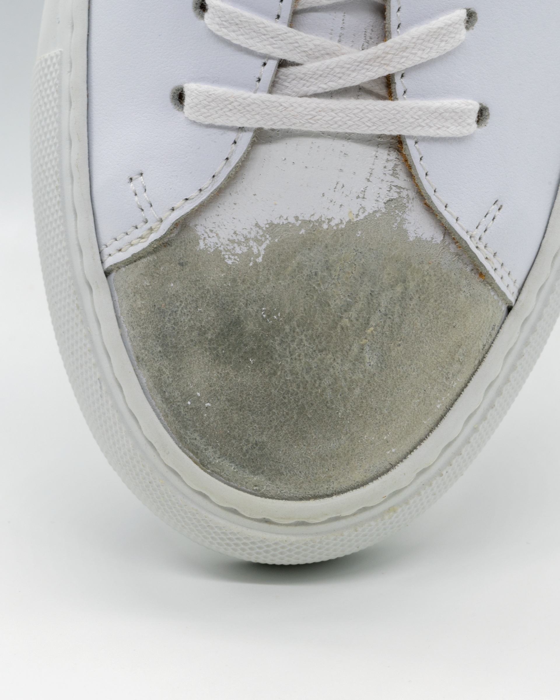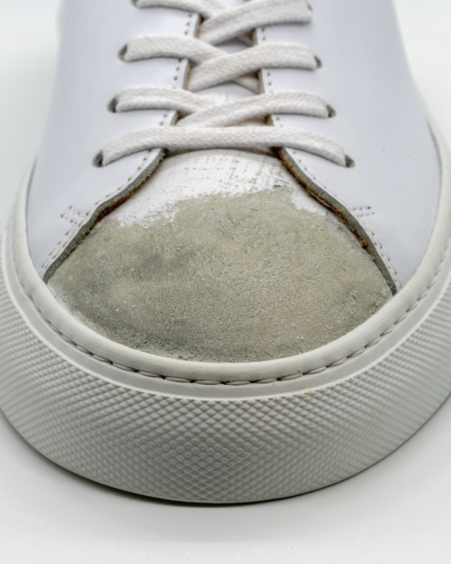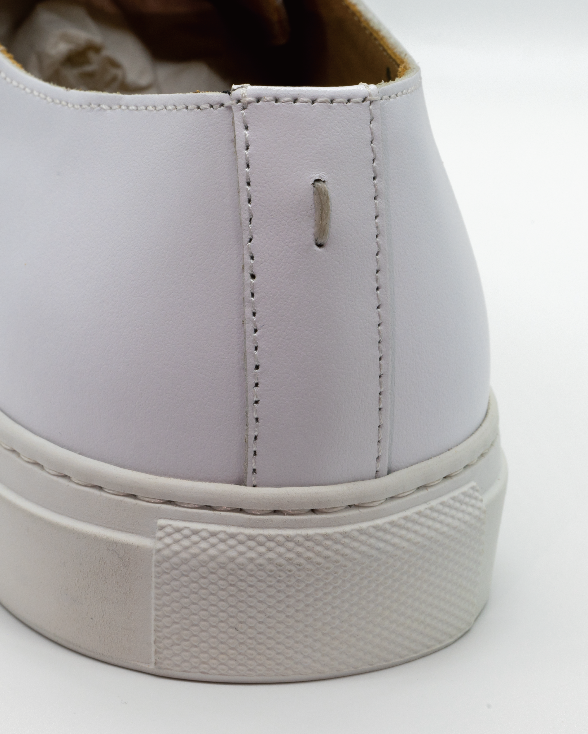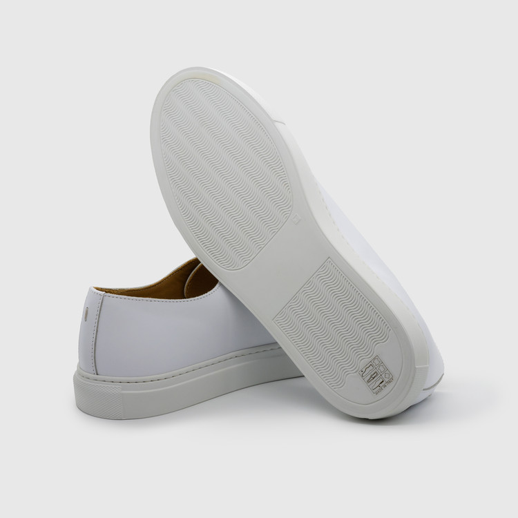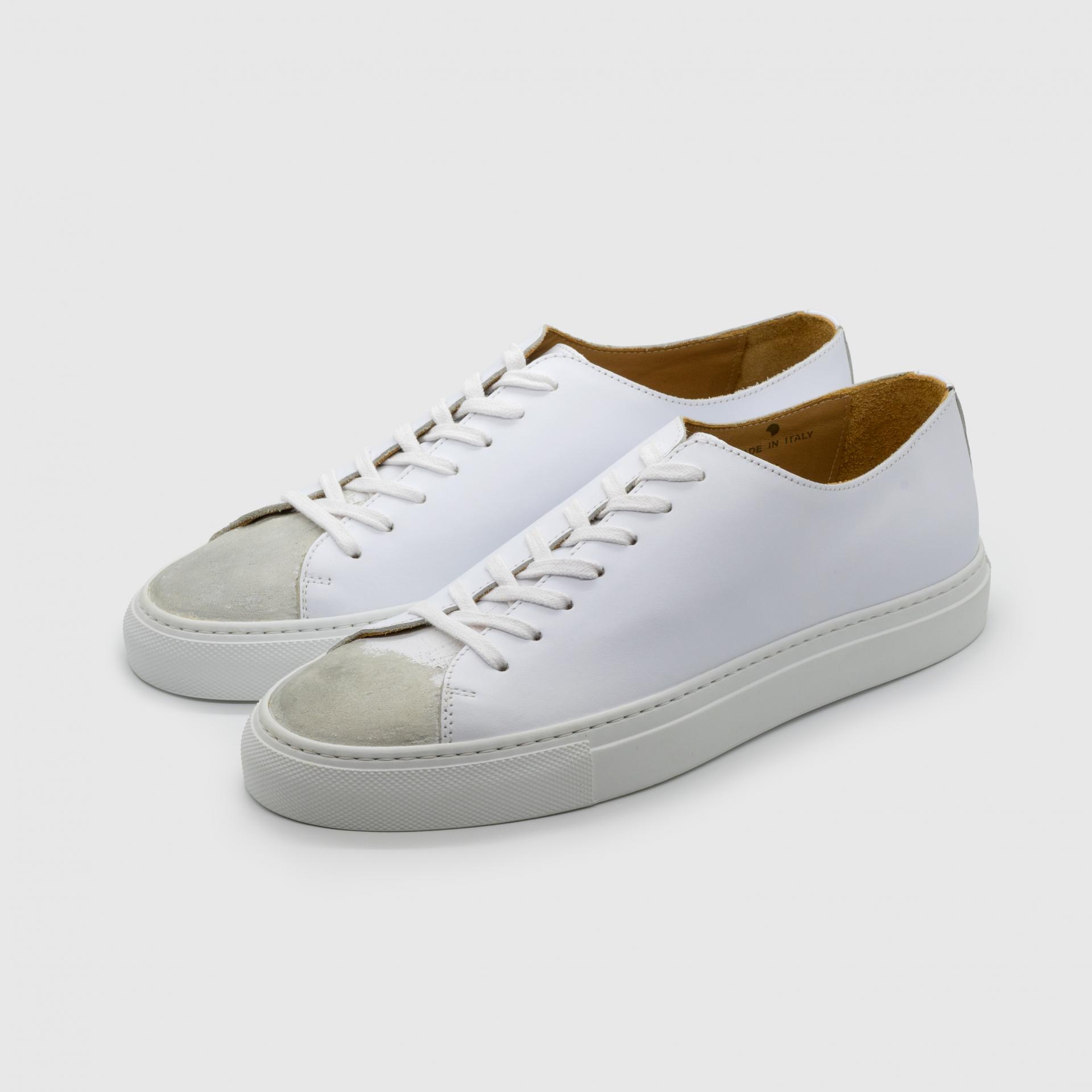 화이트 색상의 송아지 가죽 로우탑 스니커즈. 데미지 처리된 토박스(toebox). 토박스 부위 왁싱처리. 둥그런 신발 앞코. 신발 끈으로 조임처리. 일곱 개의 끈 구멍. 신발 뒷 축에 시그니쳐 'I' 로고 스티칭. 밑창과 송아지 가죽을 바느질로 이어 연결. 송아지 가죽으로 내부 처리. 가죽색상과 동일한 색상의 스티치. 굽 높이 3.5cm.