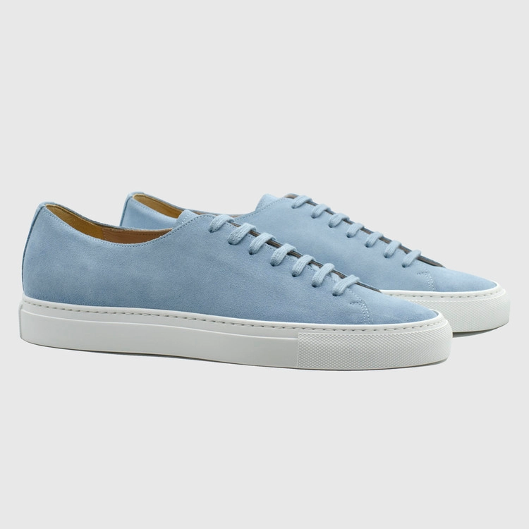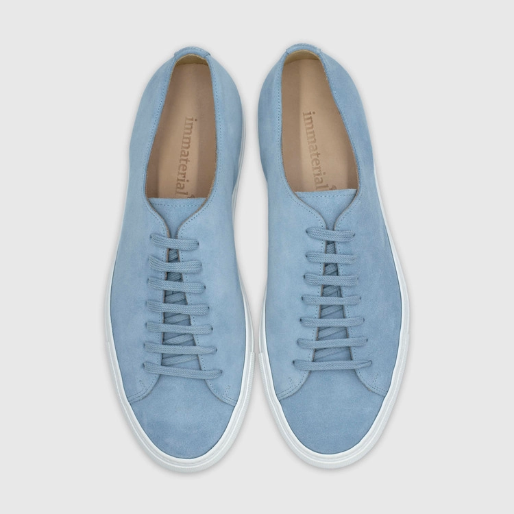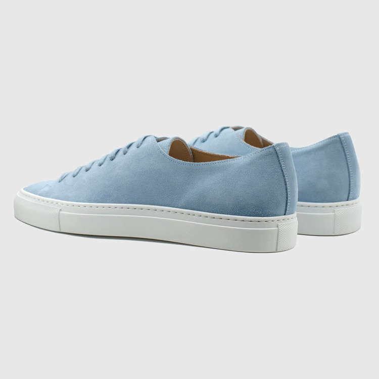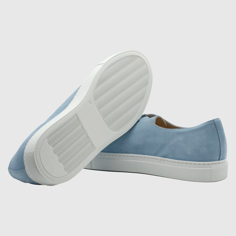 시엘 색상의 송아지 스웨이드 가죽 로우탑 스니커즈. 둥그런 신발 앞코. 신발 끈으로 조임처리. 일곱 개의 끈 구멍. 신발 베라 부분의 왼쪽 상단 가장자리에 은색 필름으로 음각 로고 처리. 밑창과 송아지 가죽을 바느질로 이어 연결. 송아지 가죽으로 내부 처리. 가죽색상과 동일한 색상의 스티치. 굽 높이 3.5cm.