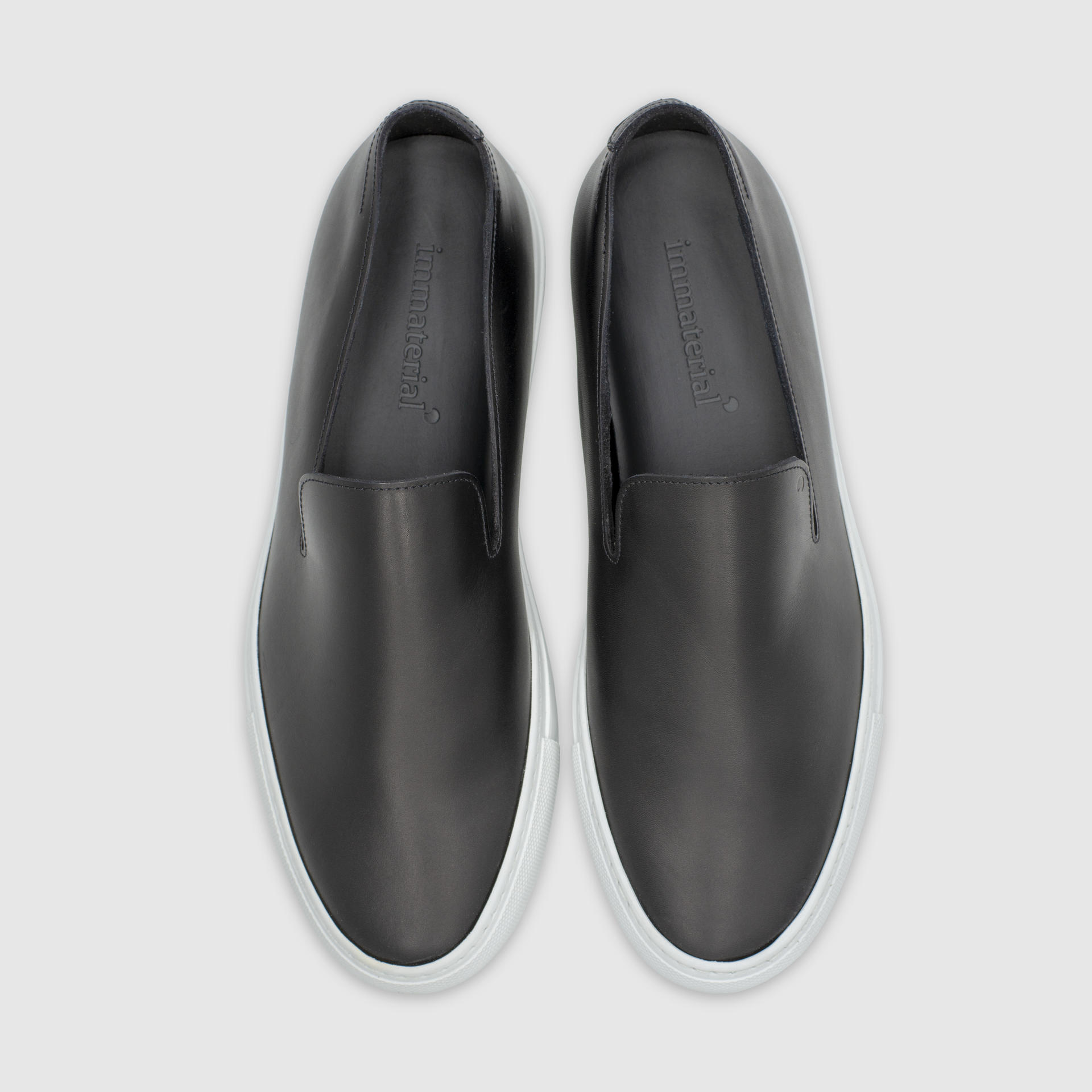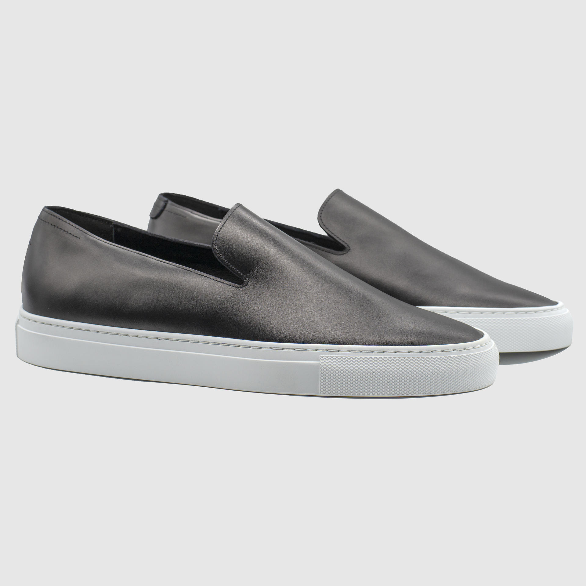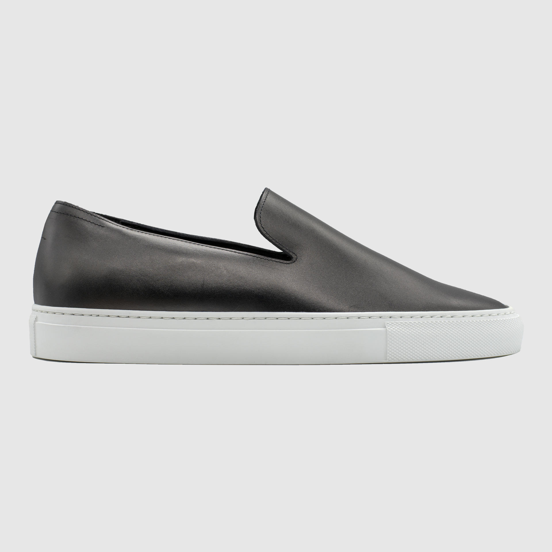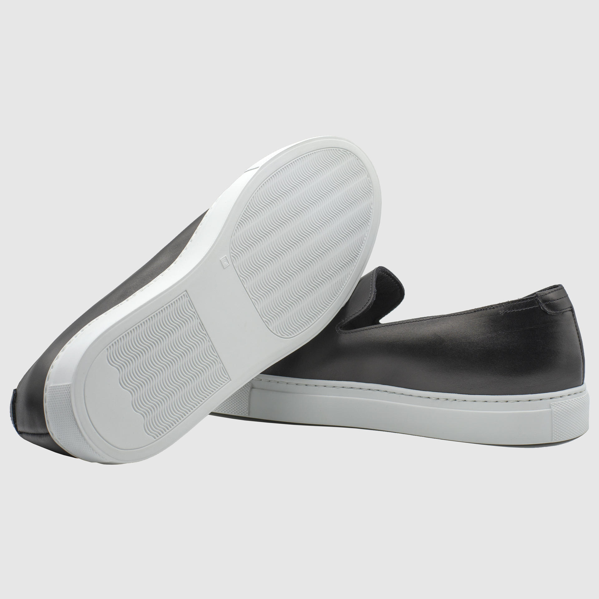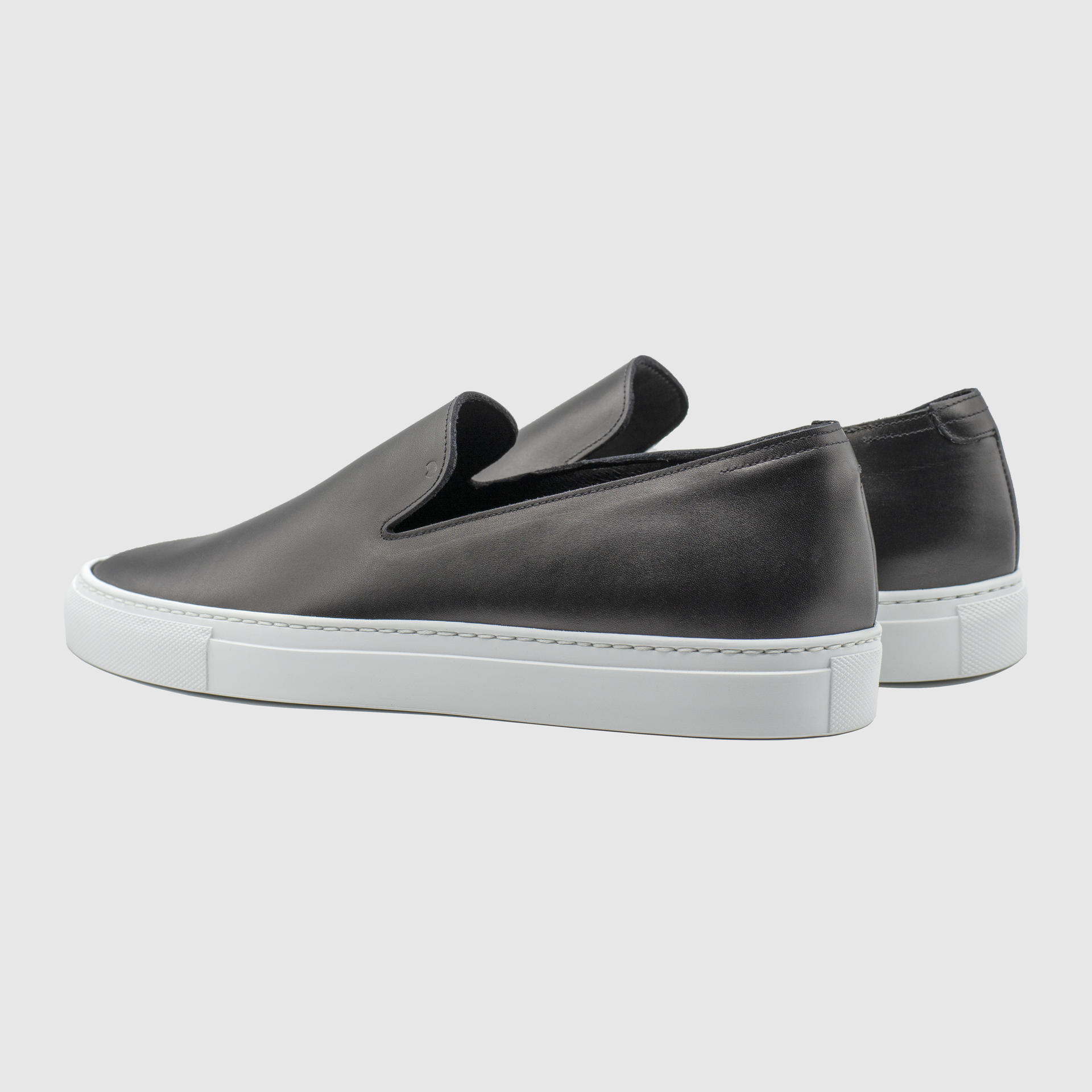 제트블랙 색상의 송아지 가죽 슬립온. 둥그런 신발 앞코. 왼쪽 상단 가장자리에 은색 필름으로 음각 로고 처리. 밑창과 송아지 가죽을 바느질로 이어 연결. 송아지 가죽으로 내부 처리. 가죽색상과 동일한 색상의 스티치. 굽 높이 3cm.