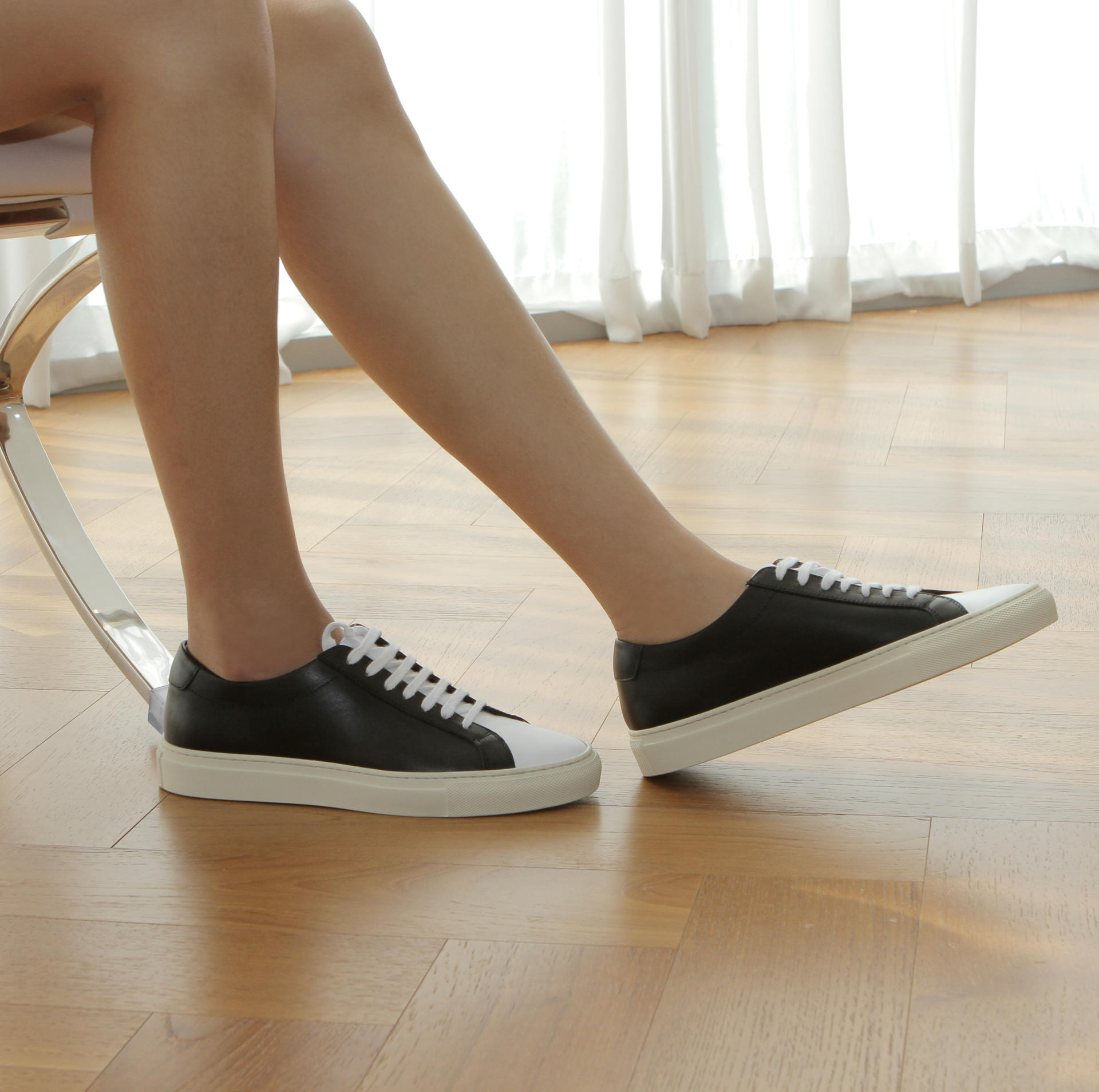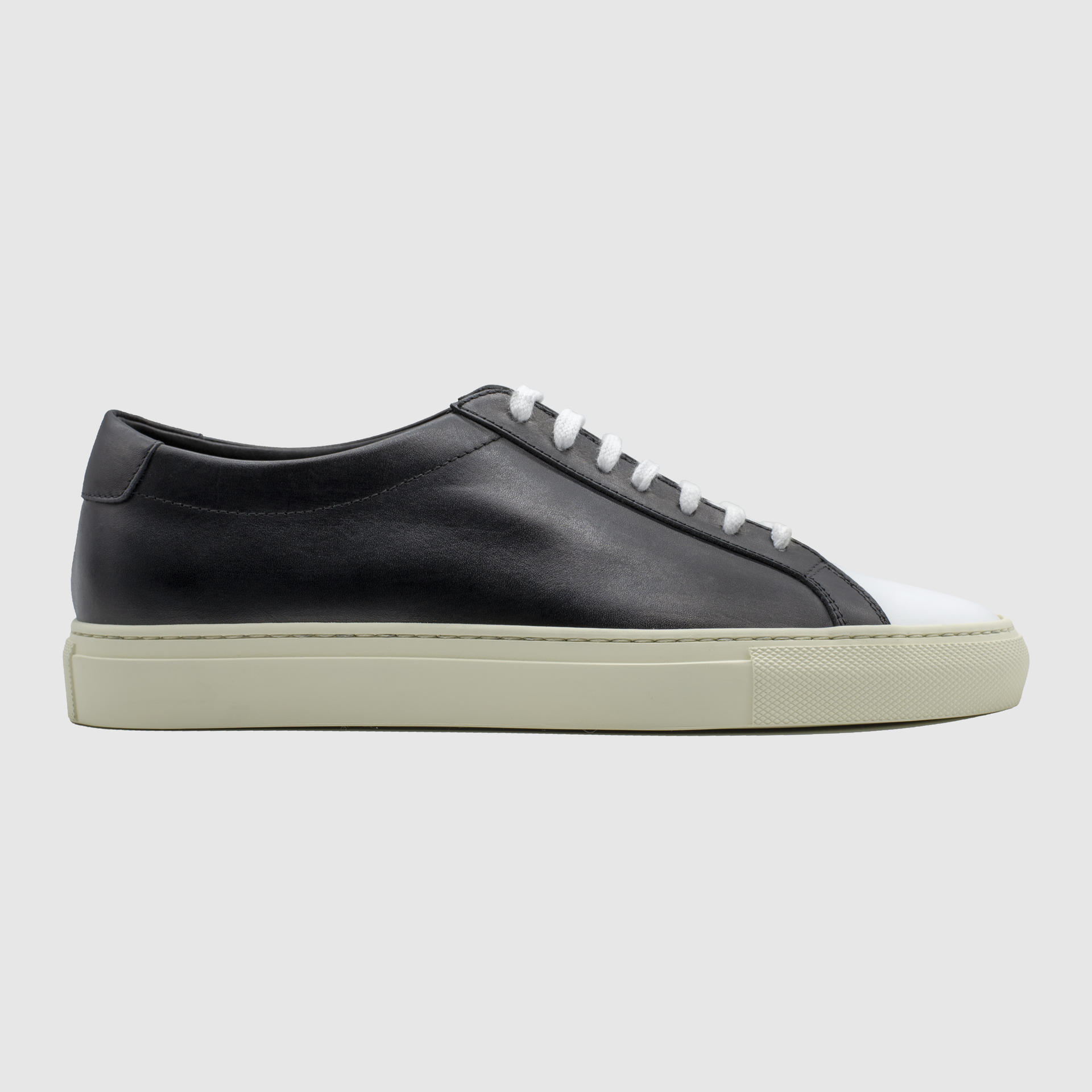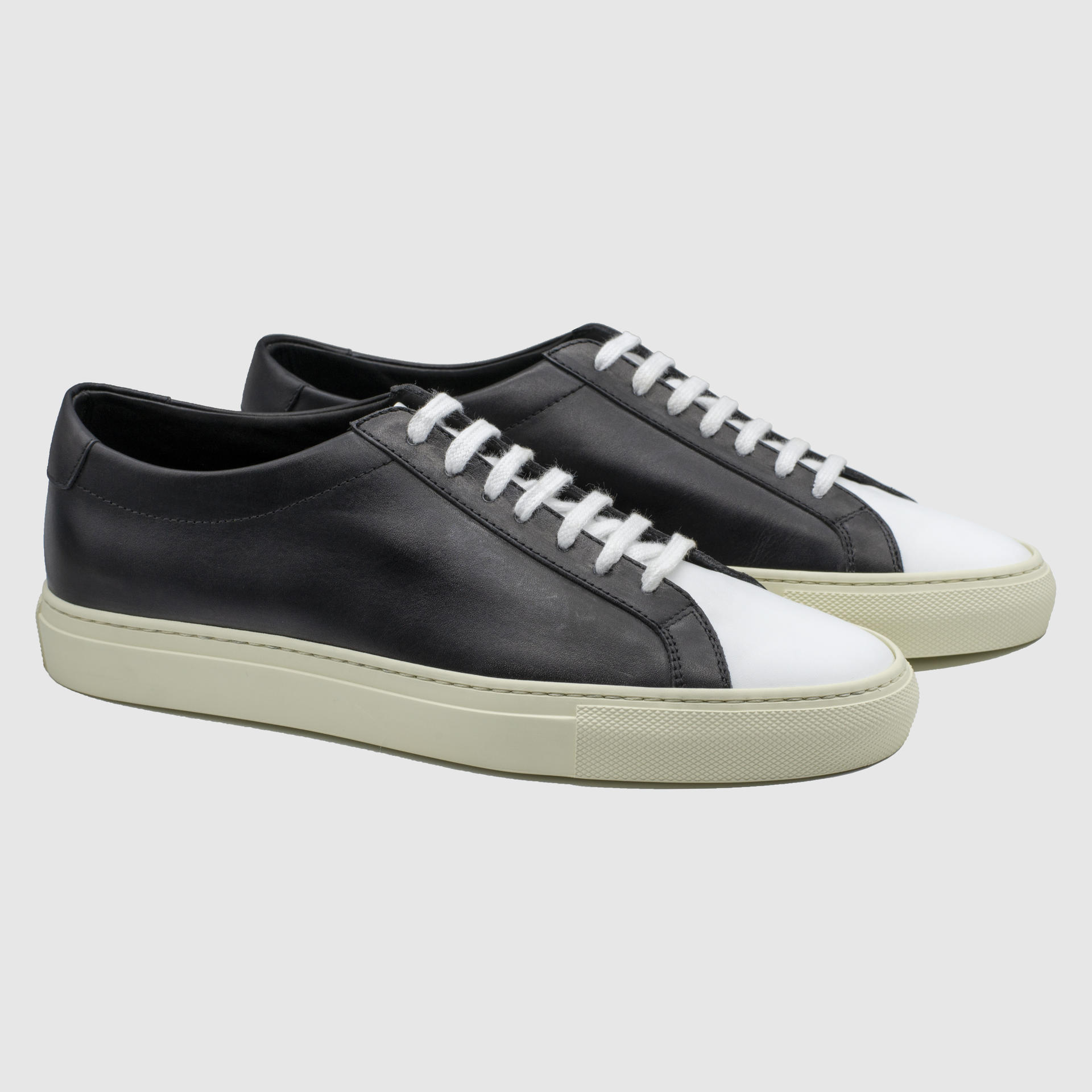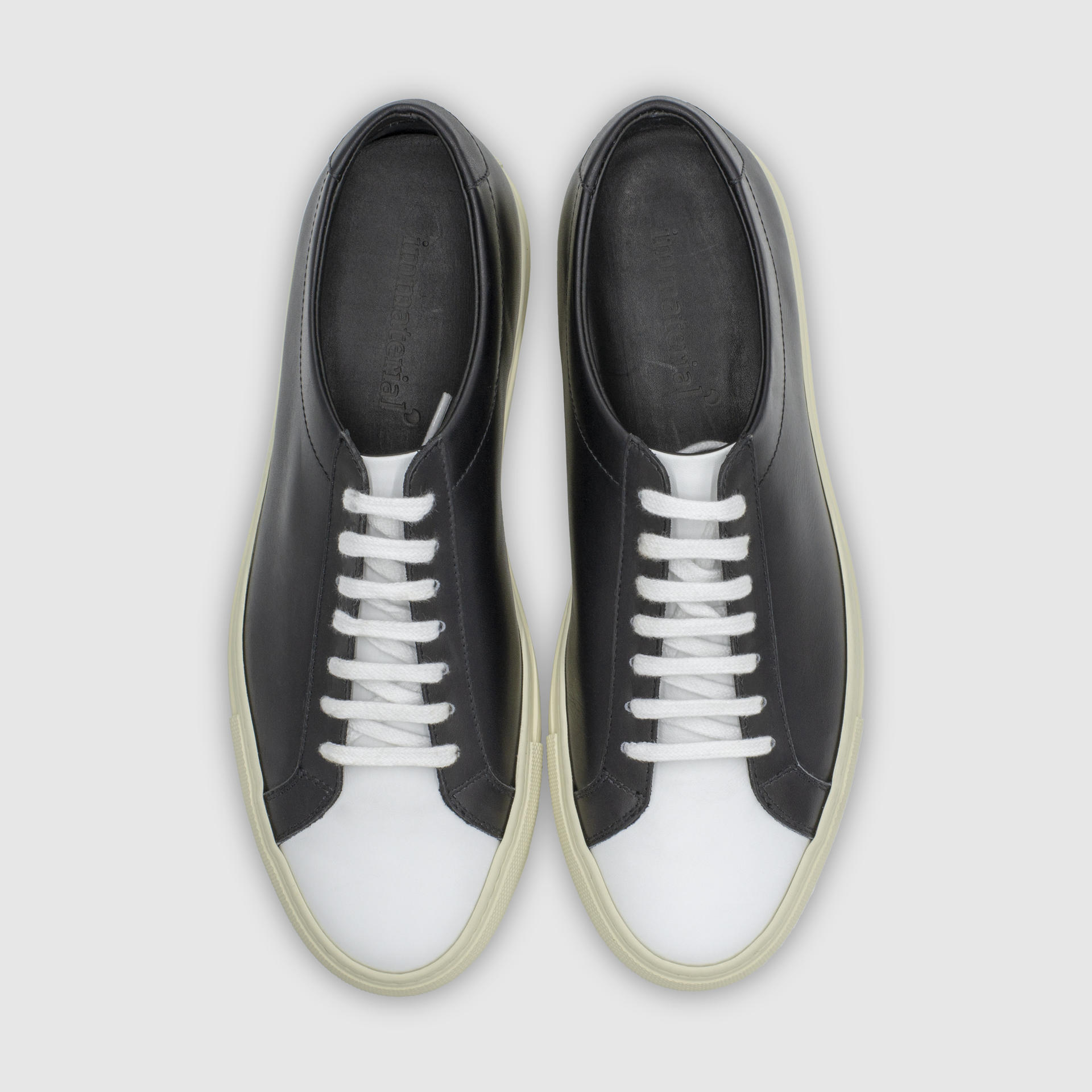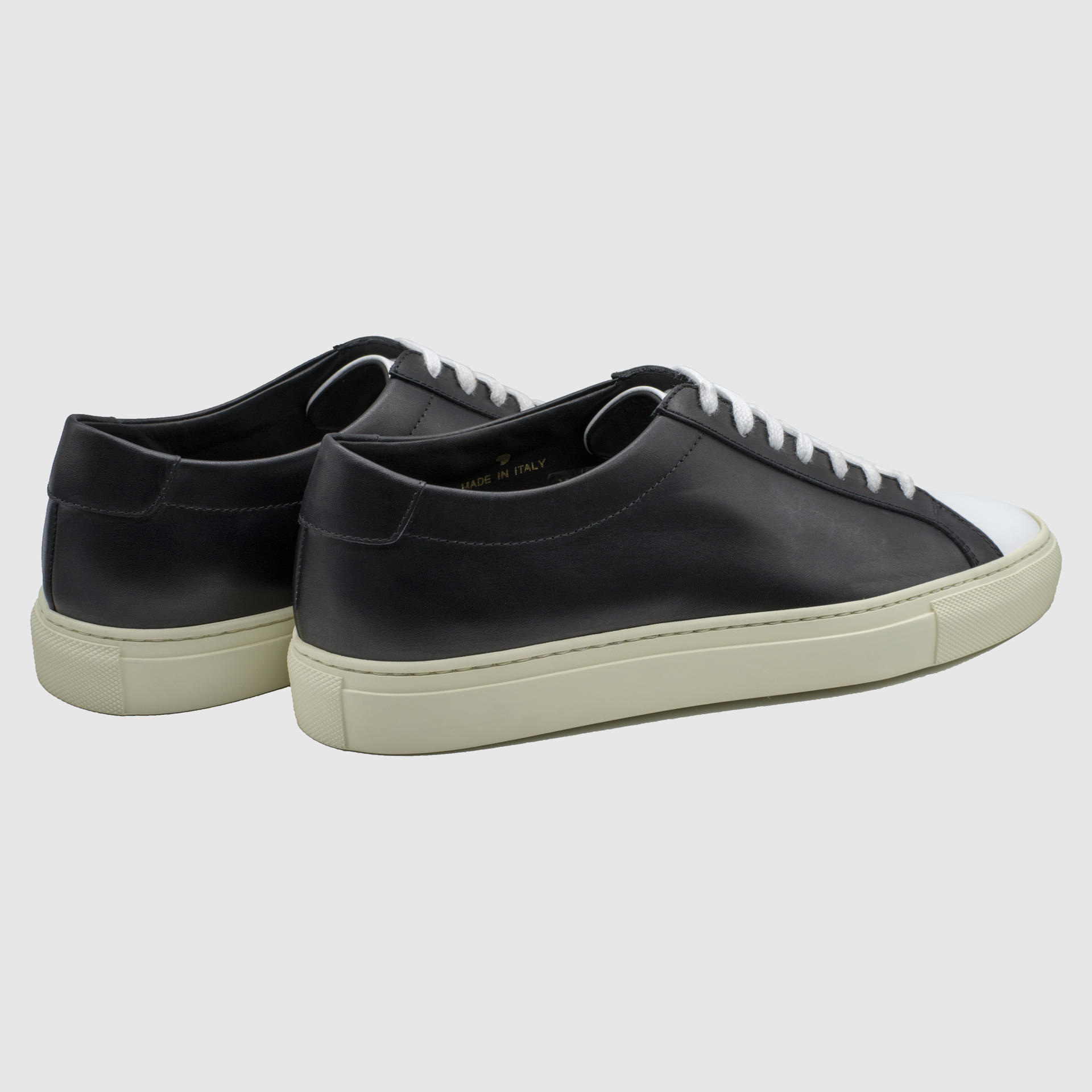 화이트 블랙 색상의 송아지 가죽 로우탑 스니커즈. 둥그런 신발 앞코. 신발 끈으로 조임처리. 일곱 개의 끈 구멍. 신발 베라 부분의 왼쪽 상단 가장자리에 은색 필름으로 음각 로고 처리. 빈티지 아웃솔. 밑창과 송아지 가죽을 바느질로 이어 연결. 송아지 가죽으로 내부 처리. 가죽색상과 동일한 색상의 스티치. 굽 높이 3cm.