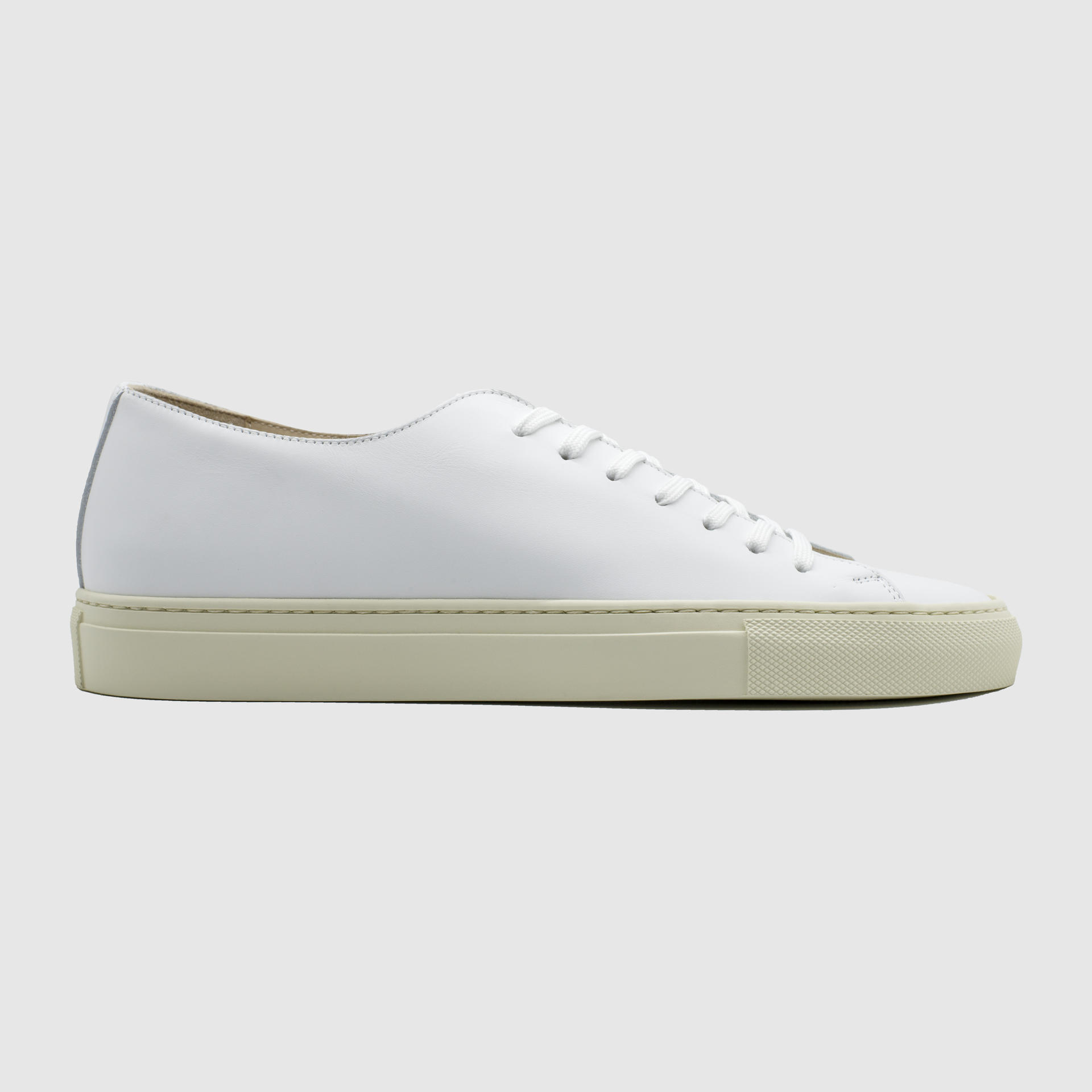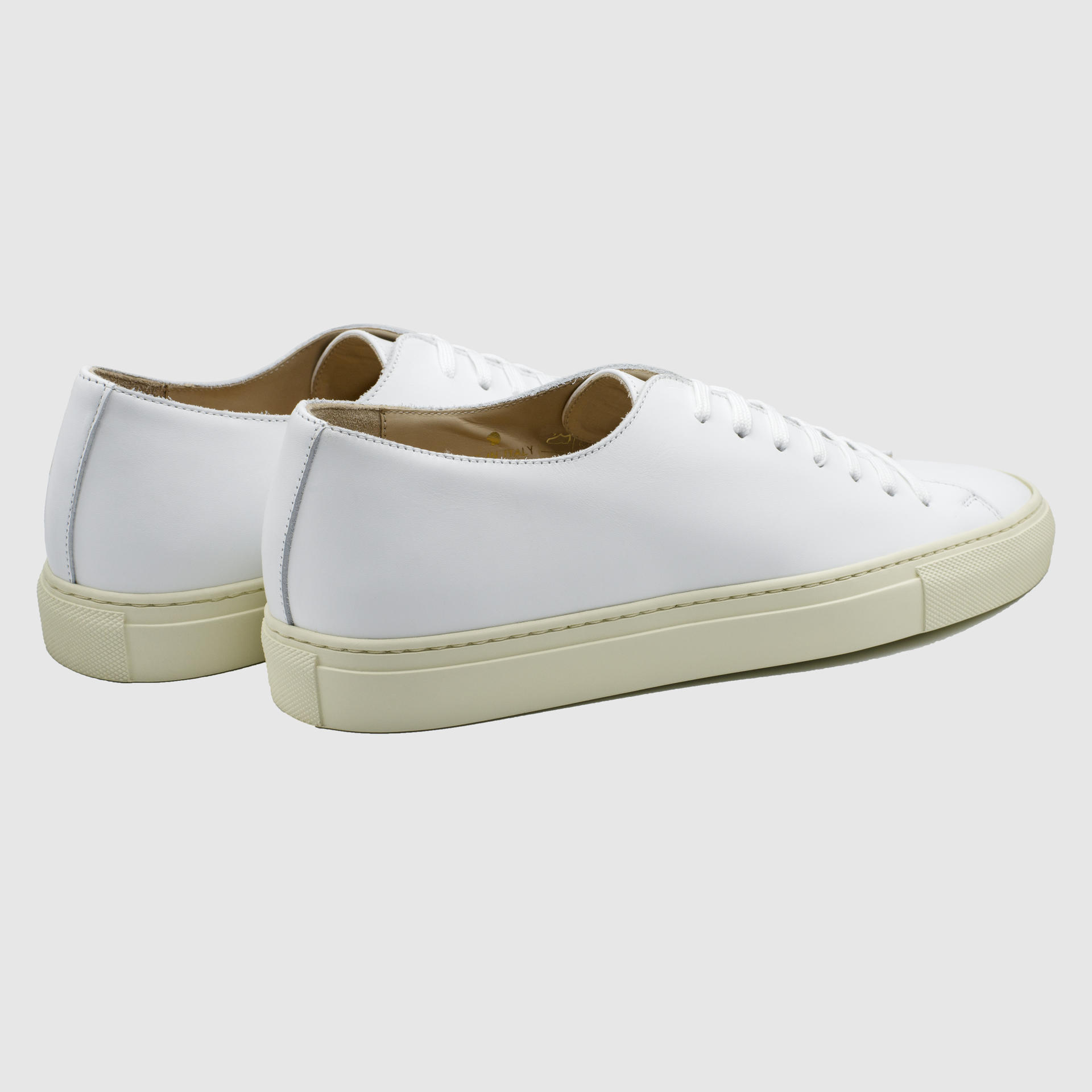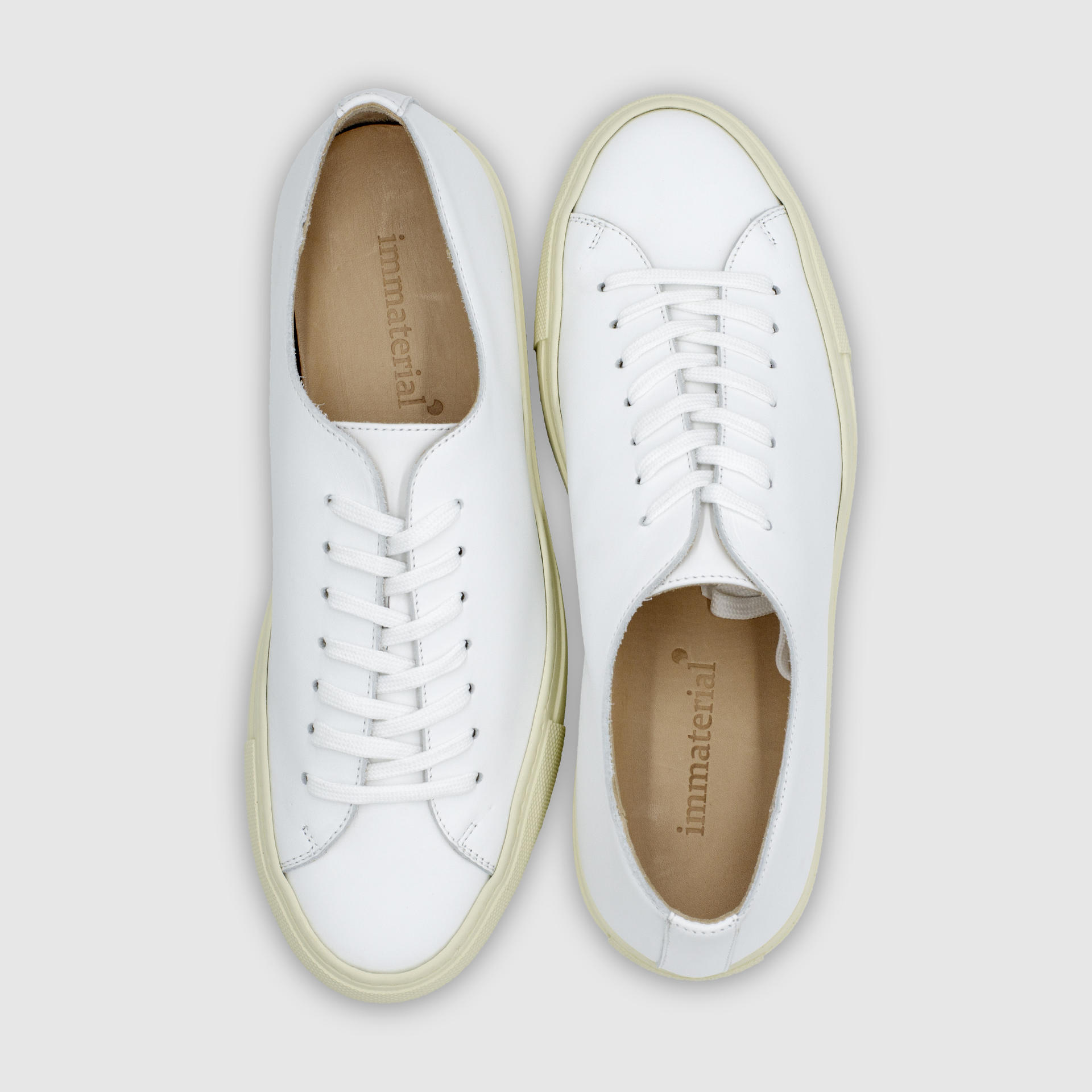 화이트 색상의 송아지 가죽 로우탑 스니커즈. 둥그런 신발 앞코. 신발 끈으로 조임처리. 일곱 개의 끈 구멍. 신발 베라 부분의 왼쪽 상단 가장자리에 은색 필름으로 음각 로고 처리. 밑창과 송아지 가죽을 바느질로 이어 연결. 송아지 가죽으로 내부 처리. 가죽색상과 동일한 색상의 스티치. 굽 높이 3cm.
