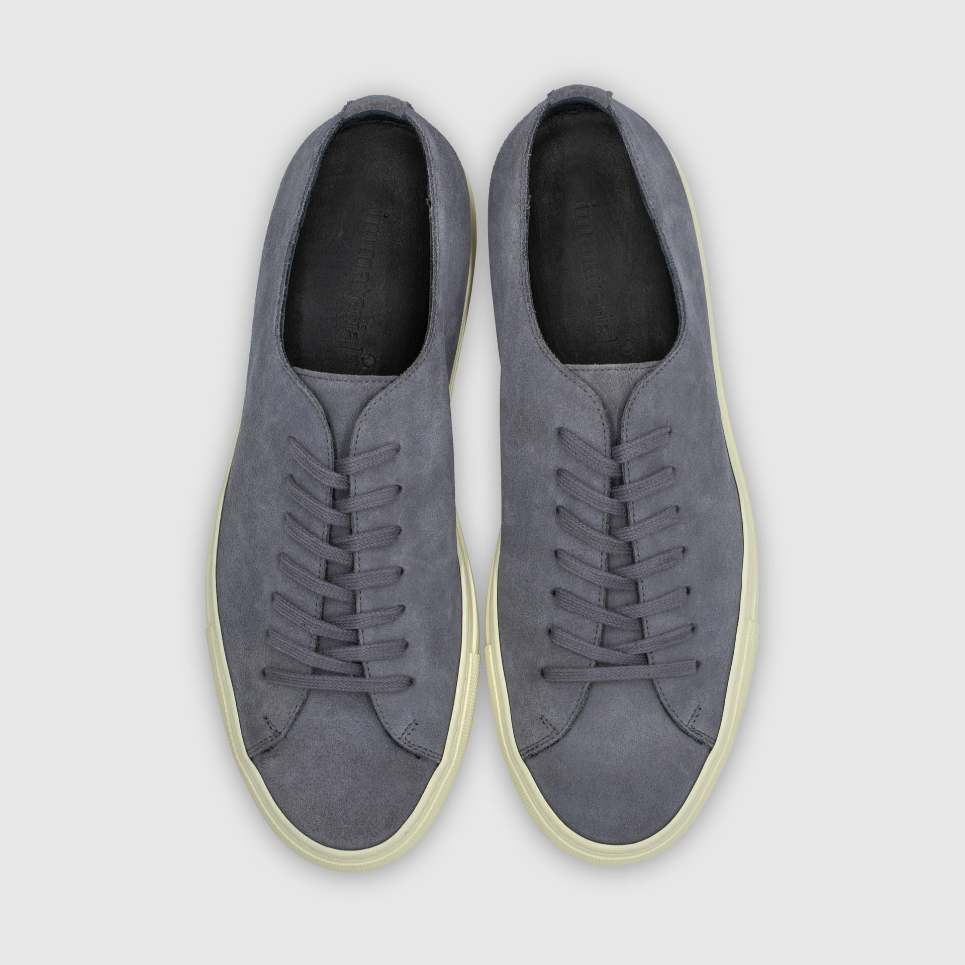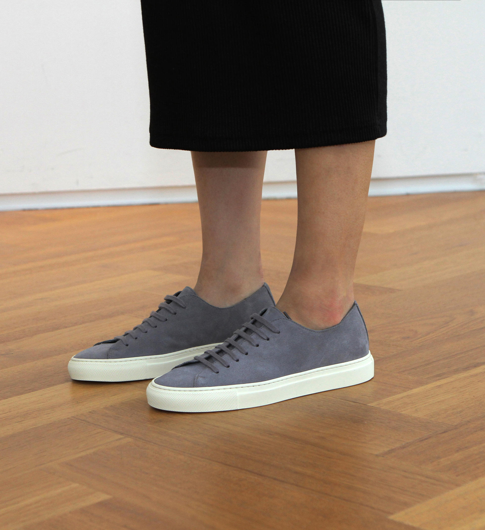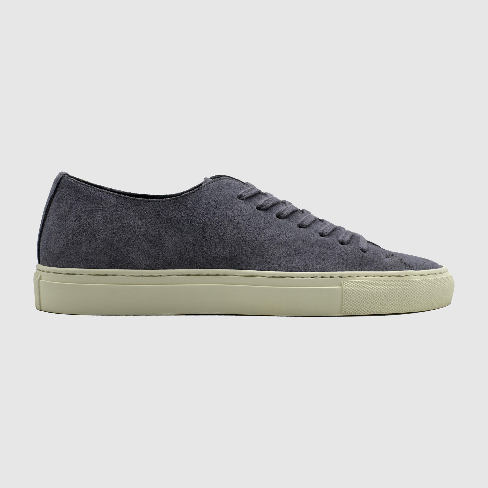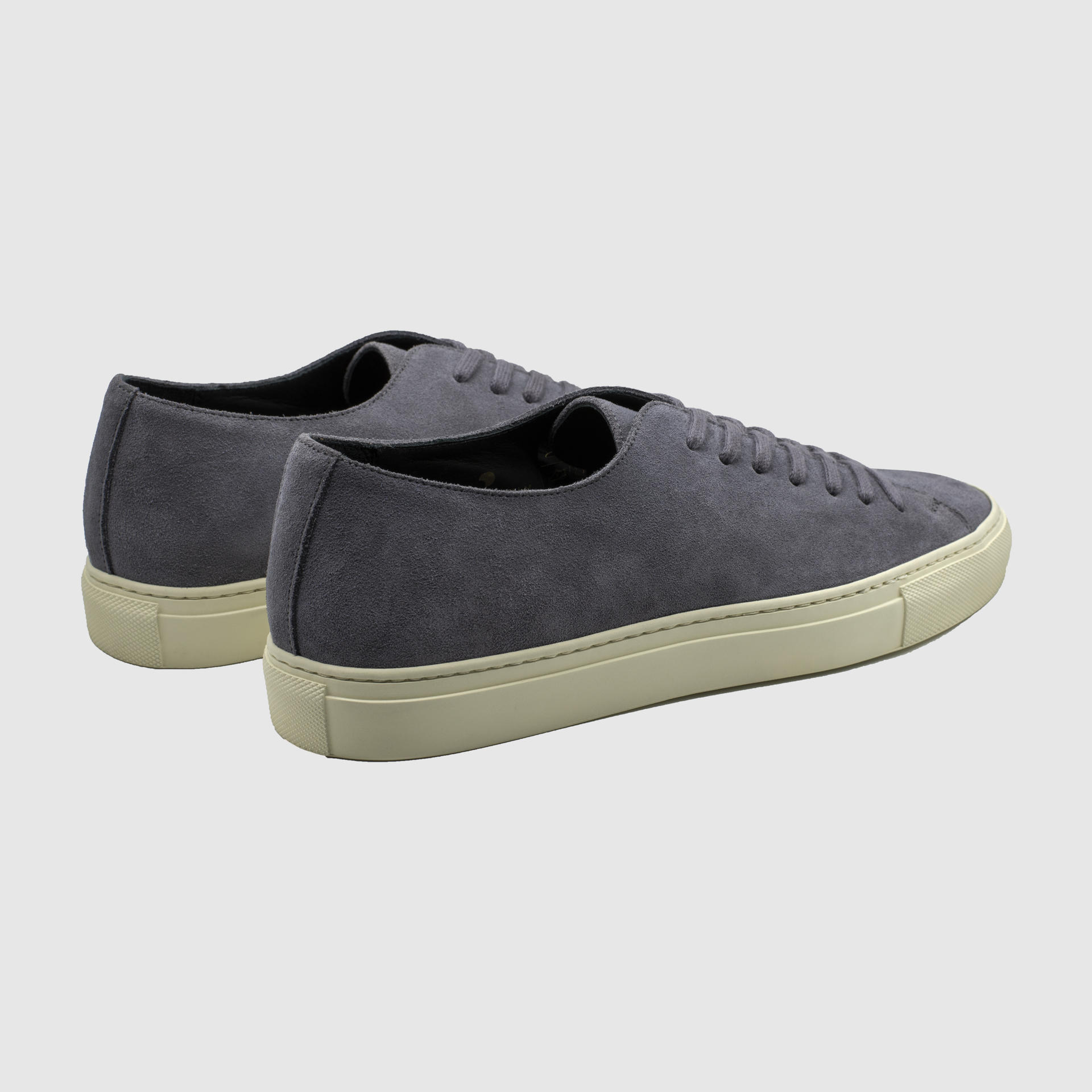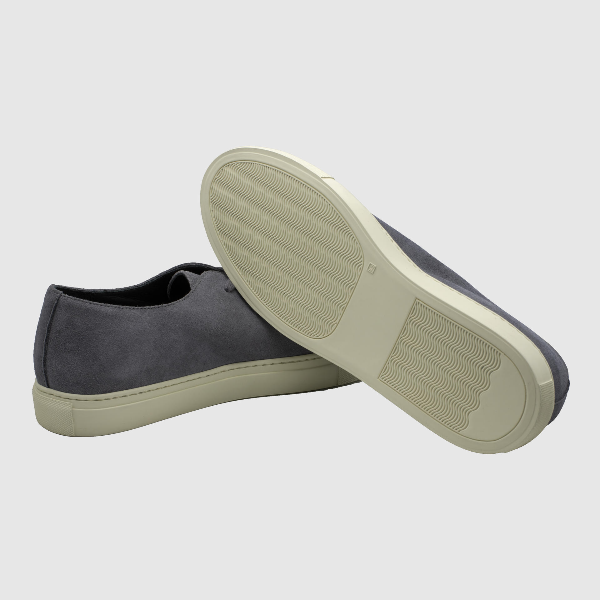 스톤그레이 색상의 송아지 스웨이드 가죽 로우탑 스니커즈. 둥그런 신발 앞코. 신발 끈으로 조임처리. 일곱 개의 끈 구멍. 신발 베라 부분의 왼쪽 상단 가장자리에 금색 필름으로 음각 로고 처리. 밑창과 송아지 가죽을 바느질로 이어 연결. 송아지 가죽으로 내부 처리. 가죽색상과 동일한 색상의 스티치. 굽 높이 3cm.